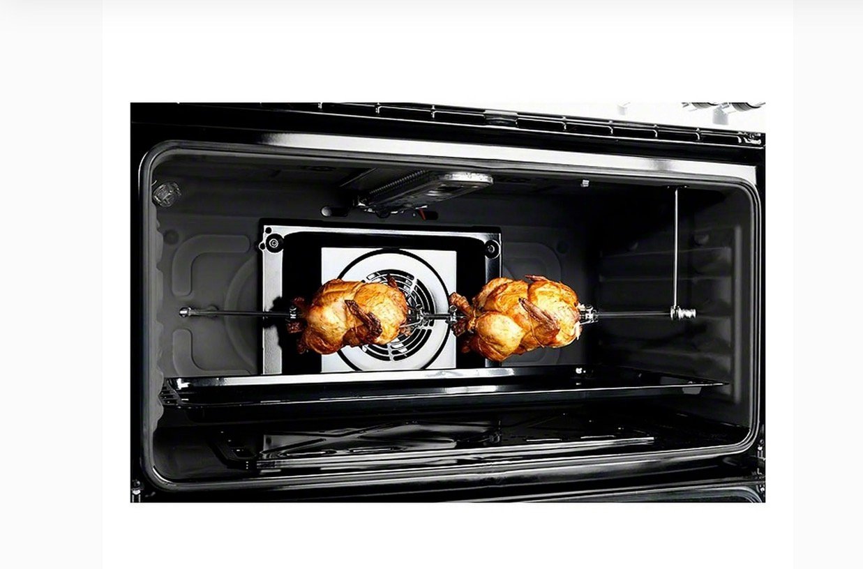 – **Additional Features**: Double glass oven door, oven lamp, grill, and rotisserie for enhanced functionality.